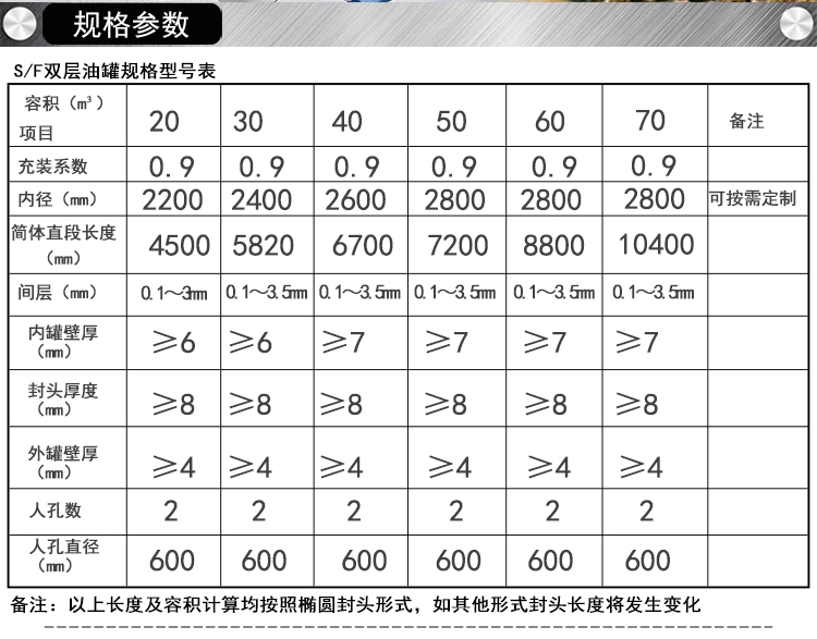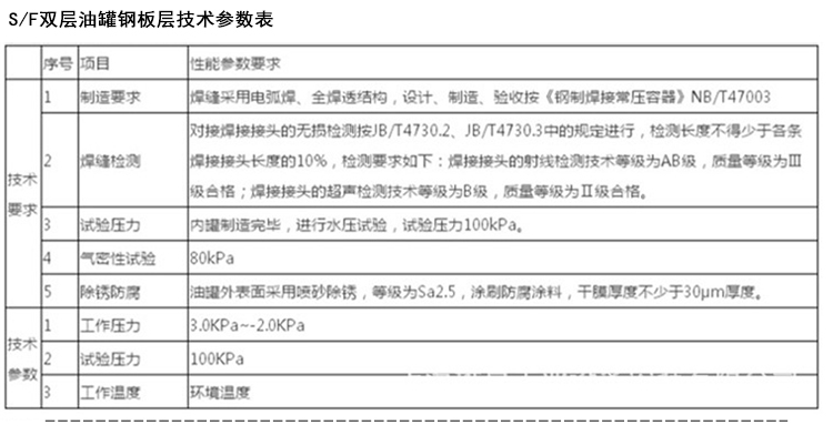 S/F双层油罐具有以下特点:一、安全性 1.内层——采用6或8mm厚的Q235-B钢板制造,与普通的厚度仅5mm的 单层油罐相比,强度大大提高; 2.外层——钢化玻璃纤维厚度达到4.0mm以上,抗压抗震性好。具有很强的耐腐蚀性、耐电蚀性: 3.内外层之间采用独特工艺技术,使其达到0.1mm~3.5mm左右的空隙,从根源上杜绝隐患的存在。泄漏检测仪24小时时时监控,杜绝泄漏造成的安全隐患二、环保性1.双1.双层结构,内有0.1mm~3.5mm的空隙,外层FRP保证了泄漏物不会直接渗漏污染土壤和水源;