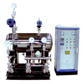 水水直混式换热机组。该机组主要由混合罐、循环泵、回水加压泵、温控装置、控制仪表及控制柜等部分构成。本机组换热效率高,制造成本低,节能效果显著,其主要特征在于一次高温水和低温二次水在混合罐中之直接混合换热,并充分利用一次水的压力,最大限度的降低二次水的循环水泵功率。机组有如下特点: