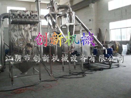 物料由料斗经螺旋输送器进入粉碎室,被高速旋转的刀片剪粉碎,通过负压风运的方法把物料运入旋风分离器,袋式除尘器,粉尘能够回收利用。