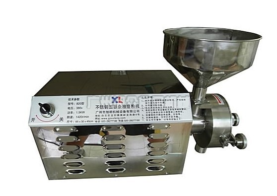 820型不锈钢“五谷杂粮磨粉机”系由广州旭朗机械设备公司独家研发生产。该机自2009年春天上市以来,得到广大用户的大力支持,我司研发部门根据客户在使用过程所出现的问题和客户建议及要求,对该磨粉机进行了一系列改良,经过反复改进试验,现已彻底解决了下料较慢、磨粉不细、刮片不耐用、调节手柄发烫、塑料环易磨损、机器振动大、噪音大等等一系列难题。 本机由优质不锈钢精加工而成,配用中国名牌电机,动力强劲,能将各种粮食、中药材等物料研磨成50~200目的粉末。该磨粉机靠两块布满齿槽的磨盘对磨运转从而将物料磨成粉末。该机属连续投料式作业,外观豪华,结构精密,噪音小,操作简便,粉碎细腻,无粉尘,特别适用于超市和商场专柜、五谷杂粮加工店使用。该机改变了普通磨粉机之外表粗糙、噪音大、出粉粗、难清理、电机动力不足等缺点,达到了食品加工的GMP卫生要求。