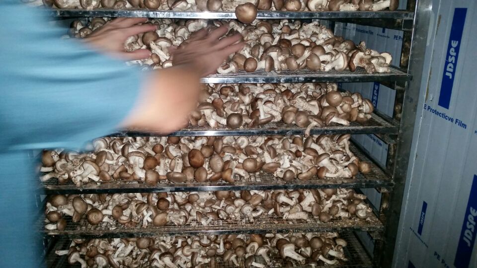 3、菇面呈白色或灰白色的菇,可以把菇面向上平放在菇筛上,用干净喷雾器均匀轻喷清水于菇面上(不能喷在菌褐上),再放进烘干房,关闭门窗,闷30分钟,再进行正常烘干。一次不行可进行2—3次,这样菇面颜色一致。