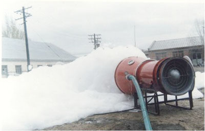 用0.3-1.0Mpa压力泡沫混合液驱动水轮带动风轮旋转,混合液经过喷头把泡沫混合液以雾状形式喷向发泡网,在网的内表面形成一层薄膜,由风轮吹到网上的风,吹胀成大量气泡,构成为高倍数泡沫,淹没或覆盖燃烧物体表面。利用泡沫的遮断,冷却和窒息作用达到灭火的目的。在全淹没和局部应用高倍数泡沫灭火系统中,它固定在防护区,达到灭火的目的。