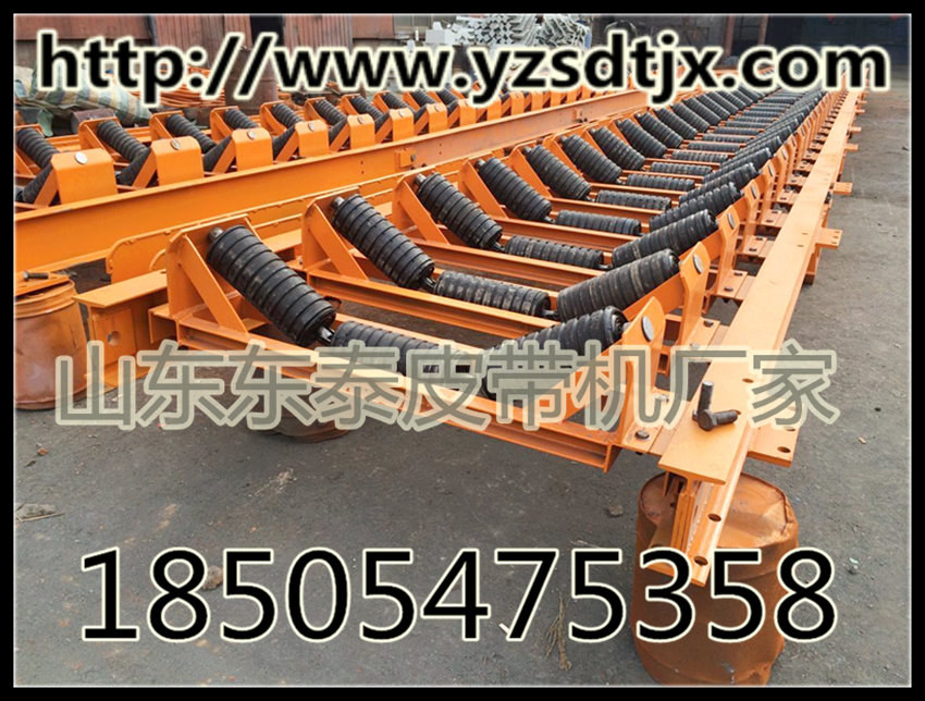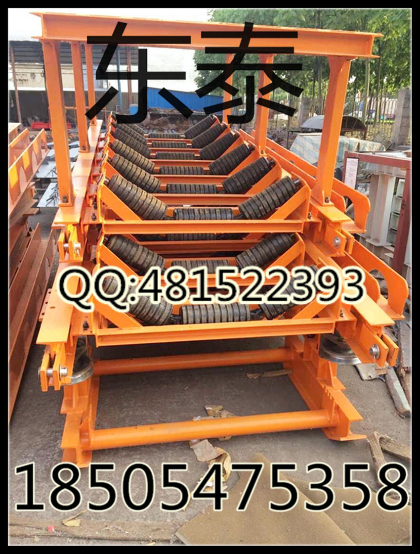 2.安装调心托辊组 调心托辊组有多种类型如中间转轴式、四连杆式、立辊式等其原理是采用阻挡或托辊在水平面内 方向转动阻挡或产生横向推力使皮带自动向心达到调整皮带跑偏的目的。一般在皮带输送机总长度较短时或皮带输送机双向运行时采用此方法比较合理,原因是较短皮带输送机更容易跑偏并且不容易调整。而长皮带输送机最好不采用此方法,因为调心托辊组的使用会对皮带的使用寿命产生一定的影响。