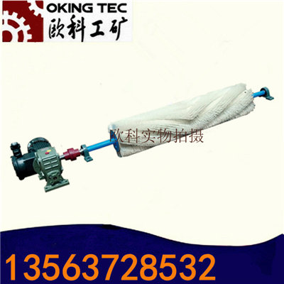 煤矿用滚刷清扫器能有效的清扫滚筒表面和输送带底面粘附物,由电动机驱动圆柱型尼龙刷,刷尖与带面轻微接触,尼龙刷的旋转方向与回程输送带的运行方向相反,从而将粘在带面上的微粒料刷下,达到彻底清洁的目的。