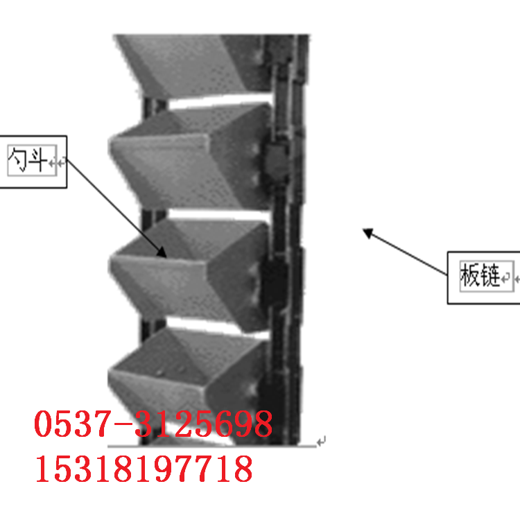 1、运行部件:由料斗和套筒滚子链组成;2、驱动装置(左、右装配):由驱动平台、驱动组合(减速器、电机、液力耦合装置)、传动链组成;3、上部装置:上部机壳、上罩、卸料口、上轴装置、逆止器;4、中部机壳:标准节(2m)和非标节(1~1.5m),包括带检视门的中间节;5、下部装置:下部机壳、进料口、尾轴装置、张紧装置。