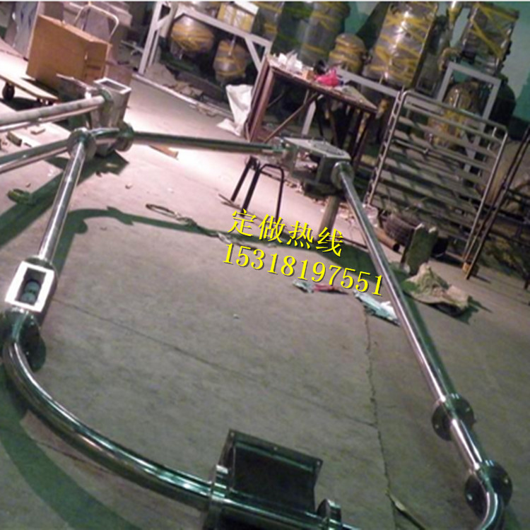 管链输送机是输送粉状、小颗粒状及小块状等散状物料的连续输送设备,可以水平、倾斜和垂直组合输送。在密闭管道内,以链片为传动构件带动物料沿管道运动。当水平输送时,物料颗粒受到链片在运动方向的推力。当料层间的内摩擦力大于物料与管壁的外摩擦力时,物料就随链片向前运动,形成稳定的料流;当垂直输送时,管内物料颗粒受链片向上推力,因为下部给料阻止上部物料下滑,产生了横向侧压力,所以增强了物料的内摩擦力,当物料间的内摩擦力大于物料与管内壁外摩擦力及物料自重时,物料就随链片向上输送,形成连续料流。