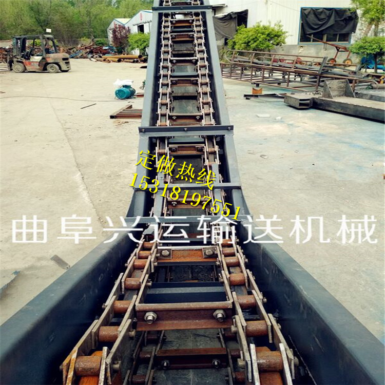 在垂直提升时,物料受到刮板链条在运动方向的压力,在物料中产生了横方向的侧面压力,形成了物料的内摩擦力。同时由于下水平段的不断给料,下部物料相继对上部物料产生推移力。这种摩擦力和推移力足以克服物料在机槽中移动而产生的外摩擦阻力和物料自身的重量,使物料形成了连续整体的料流而被提升。