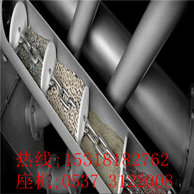 管链输送机是输送粉状、小颗粒状及小块状等散状物料的连续输送设备,可以水平、倾斜和垂直组合输送。在密闭管道内,以链片为传动构件带动物料沿管道运动。当水平输送时,物料颗粒受到链片在运动方向的推力。当料层间的内摩擦力大于物料与管壁的外摩擦力时,物料就随链片向前运动,形成稳定的料流;当垂直输送时,管内物料颗粒受链片向上推力,因为下部给料阻止上部物料下滑,产生了横向侧压力,所以增强了物料的内摩擦力,当物料间的内摩擦力大于物料与管内壁外摩擦力及物料自重时,物料就随链片向上输送,形成连续料流。