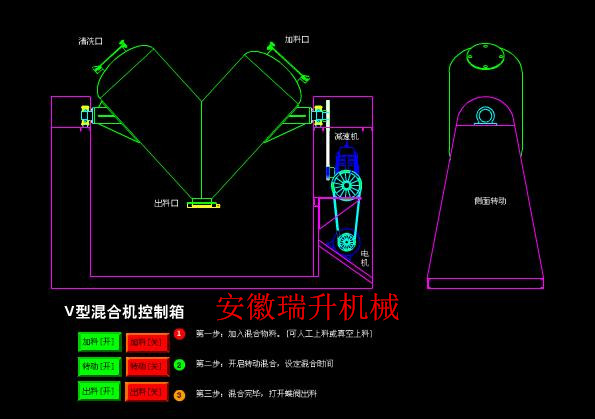 V型混合机是安徽瑞升机械推出的一款新产品,是我公司技术人员在吸取国内外先进技术的基础上,结合我公司的生产经验精心研制而成的新型搅拌混合设备,本V型混合机采用手工进料和封闭碟形阀出料结构,可以实行无粉尘操作,同时物料在混合时没有机械挤压和强烈摩擦,可以保持物料颗粒完好无损,本V型混合机混合采用不锈钢制造,对混合物料无任何污染。另外,本机还装有定时装置,可以控制物料的混合时间。