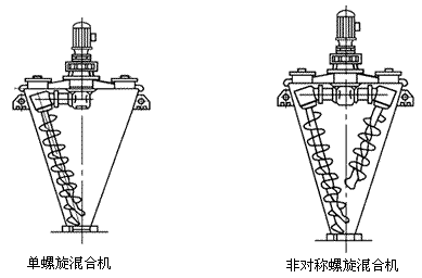 双螺旋锥形混合机,它由喷液装置、传动部分、筒盖、螺旋、筒体、出料阀箱等组成。