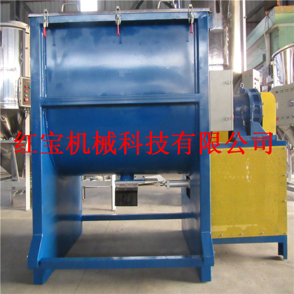 2、选择卧式塑料搅拌机要注意出料方式。应选择大开门的形式,不要选择侧口或底开口的出料形式。原因是:当混合机在规定时间完成搅拌混合后,时间内一次放清可保证物料的均匀度;如用侧口或底部小开口螺旋带逐渐放净,一是耽误时间,达不到预期生产率,二是物料本已达到均匀度,过度搅拌反而会使物料离析,破坏了均匀度,从而失去了选用卧式混合机的意义。3、根据卧式塑料搅拌机工作原理,用于搅拌混料的双螺旋带向相反方向推送物料的能力应是基本一致的。由于内螺旋带的螺距应小于外螺旋带,为达到推送物料的能力一致,内螺旋带的螺距应小于外螺旋带,而宽度应大于外螺旋带,否则会使物料向一个方向集中。因此,在选择卧式混合机时要注意这一点。4、使用卧式塑料搅拌机要注意投料的次序。一般是先投大料,如玉米粉、豆粕粉等,然后再投小组分料,如预混料。注意预混料一定不用螺旋提升机投料,应用一次性翻斗式投料,或用人工投料,这样可以避免预混料中有效成分的离析流失。5、按设计原理,卧式混料机中螺旋带与壳体之间的间隙可以为4毫米~10毫米,物料可以用摩擦力带动全部参加混合。但由于粉碎粒度及物料的摩擦系数不一样,因此会使各种组分的物料参加混合的时间不一样,造成产品的不均匀性。目前有的厂家已意识到这一点并对产品作了改进。一种是注意加工精度,使底隙减少到1毫米~2毫米;另一种是将主轴与壳体之间做成位置可调整的形式,根据磨损量可经常调整螺旋带与壳体之间的间隙。在选择混合机时,这两种形式的产品应是选择。6、使用卧式混料机,应在卧式混料机启动后再逐批投料。