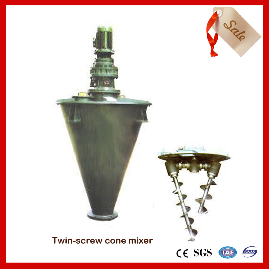 锥形混合机的搅拌部件为两条不对称悬臂螺旋;长短各一,它们在绕自己的轴线转动(自转)的同时,还 环绕锥形容器的中心轴;借助转臂的回转在锥体壁面附近又作行星动(公转);该设备通过螺旋的公、自转使物料反复提升,在锥体内产生剪切、对流、扩散等复合运动,从而达到混合的目的。