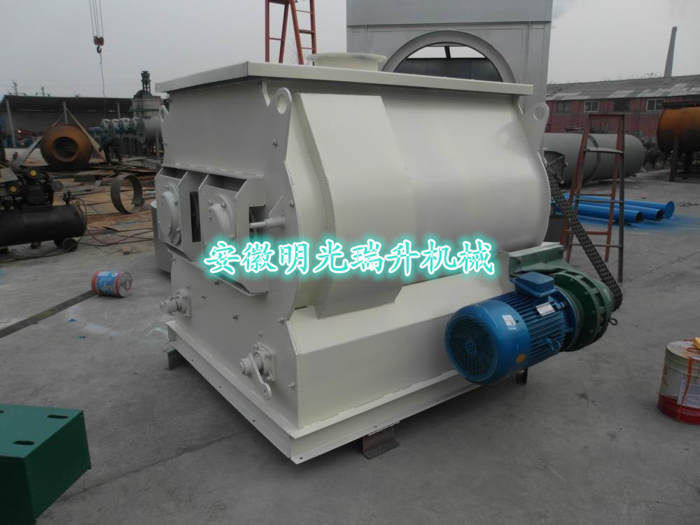加碘食盐混合机以强烈、高效混合为特点、卧式筒体内两根搅拌等速反向旋转,上特殊布置的桨叶确保物料径向、环向、轴向三向运动,形成复合循环,在极短的时间内达到均匀混合。