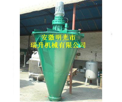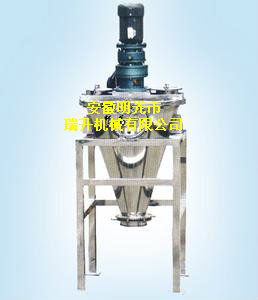 锥形混合机由摆线针轮减速机连接中心螺杆及外层螺带以相同转速转动。工作时,中心螺杆将混合物料由底部提升到顶部,同时线速度较大的外部螺带将物料由下而上沿锥形筒壁盘提升,二种运动在离心力作用下又将物料沿切线方向抛向空间,物料产生强烈的对流剪切、扩散,从而达到快速混合的目的。(螺杆也可做成反向螺杆)。