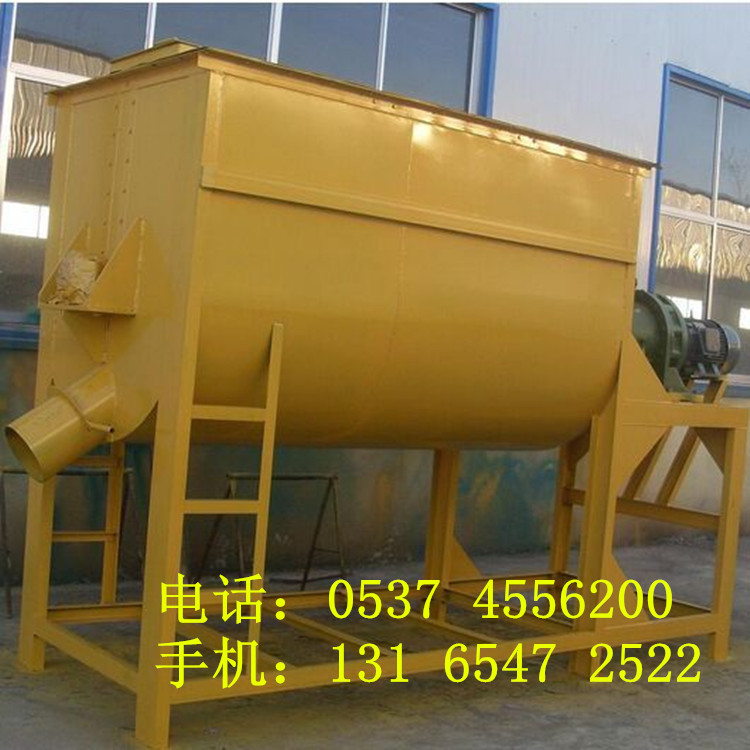 卧式螺带混合机:卧式双轴螺带混合机是搅拌干的、粉状的物料,起到搅拌混合均匀的目的。搅拌时机内物料受两个相反方向运动的转子运动,进行着复合运动,双轴桨叶带动物料沿着机槽内壁做顺逆两个时针旋转,靠近轴心处物料做轴心旋转,轴向由内至两侧推动,外螺旋带动靠近筒壁物料做轴心旋转,轴向由两侧至内推动,于是造成物料筒体内对流循环、剪切渗混,完成物料在较短时间内快速均匀混合。