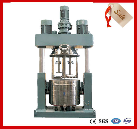强力分散机是一种高效多功能混合机,可广泛应用于粘合剂、化妆品、化工产品、电池、食品、药品和塑料工业等行业。强力分散机采用变频调速,可满足各种工艺要求。强力分散机釜内有三根不同形式的搅拌器,其中一个搅拌器在绕釜体轴线转动,其余两个搅拌装置又以不同的转速绕自身轴线高速自转,使物料在釜内作复杂的运动,受到强烈的剪切和搓合。设备内山形刮刀绕釜体轴线转动,将粘在壁上和底部的原料刮出参与混合,使其效果更为理想。设备密封性好,可抽真空,具有良好的排气除泡效果。强力分散机缸盖可液压升降,缸体可自由移动,操作十分方便。强力分散机搅拌器的形式,根据物料要求可为多层桨叶式、框式、蝴蝶式、叶轮式等。