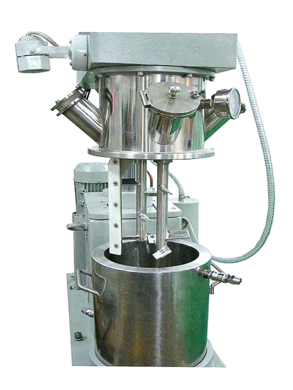 行星搅拌机具有独特、新颖的搅拌形式,釜内有两根或三根搅拌器和一至两个自动刮壁刀,搅拌器在绕扶梯轴线公转的同时,又以不同的转速绕自身轴线自转,使物料在釜内做复杂运动,收到强烈的剪切和搓合。此外,设备内的刮壁刀绕釜体轴线转动,将粘在壁上之物料刮下参与混合,使其效果更为理想。设备釜盖可液压升降,,缸体可自由移动,操作十分方便。