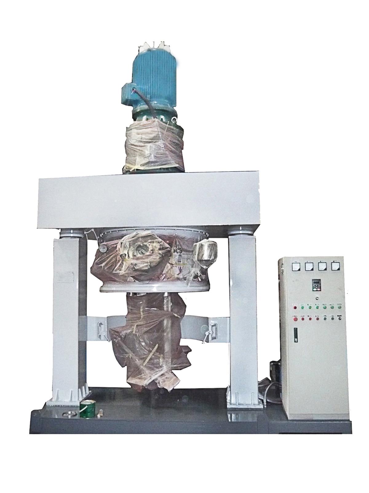立式搅拌机具有独特、新颖的搅拌形式,釜内有两根或三根搅拌器和一至两个自动刮壁刀,搅拌器在绕扶梯轴线公转的同时,又以不同的转速绕自身轴线自转,使物料在釜内做复杂运动,收到强烈的剪切和搓合。此外,设备内的刮壁刀绕釜体轴线转动,将粘在壁上之物料刮下参与混合,使其效果更为理想。设备釜盖可液压升降,,缸体可自由移动,操作十分方便。