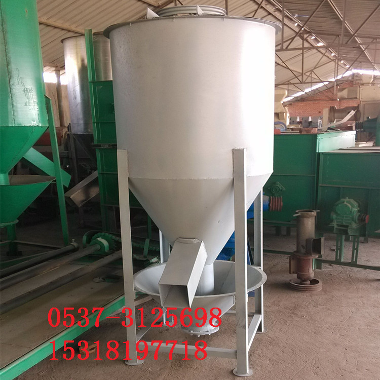 大型立式搅拌机的工作是利用螺杆的快速旋转将原料从桶体底部由中心提升至顶端,再以伞状飞抛散落,回至底部,这样原料在桶内上下翻滚搅拌,短时间内即可将大量原料均