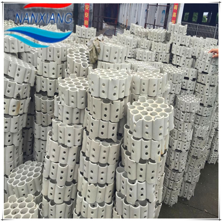 陶瓷七孔连环(陶瓷组合环)填料是我厂在原木格填料、散装填料、组合填料、轻瓷填料及泡轻瓷填料基础上研制开发的一种新型高效填料。克服了木格填料易腐蚀,散装填料安装麻烦,轻瓷泡轻瓷填料(采用石英砂等原料低温烧结而成)吸水率大,吸水后重量过高,搞压强度差等弊端。该产品是当前煤气、化工、化肥等行业洗萘塔内中较为理想的填充材料。