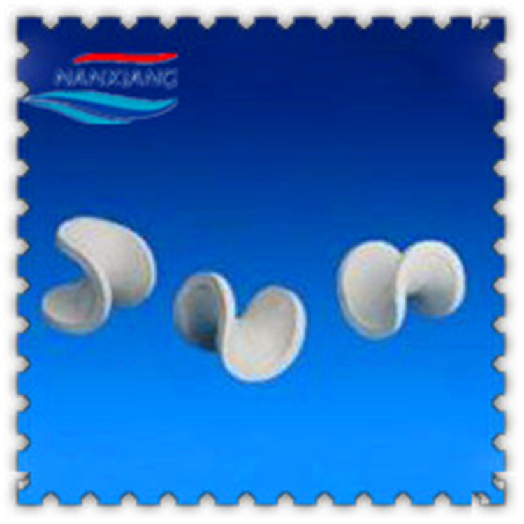 陶瓷贝尔鞍环也叫陶瓷贝尔环,又叫陶瓷弧鞍环、或者陶瓷马鞍环,陶瓷贝尔鞍环在塔内呈相互搭接,形成连锁结构的弧形气道,陶瓷贝尔鞍环有利于气液流均匀分布,并减少阻力。陶瓷贝尔鞍环与陶瓷拉西环相比之性能较好,但易叠套,在叠紧处易造成沟流,传泛点高。陶瓷贝尔鞍环在床层中比拉西环易破碎。陶瓷贝尔鞍环是出现较早的鞍形填料,形如马鞍,大小自15mm至50mm较常用,陶瓷贝尔鞍环的表面不分内外,全部敞开,流体在两侧表面分布同样均匀。陶瓷贝尔鞍环的另一特点,是堆放在塔内时对塔壁侧压力比环形填料小.
