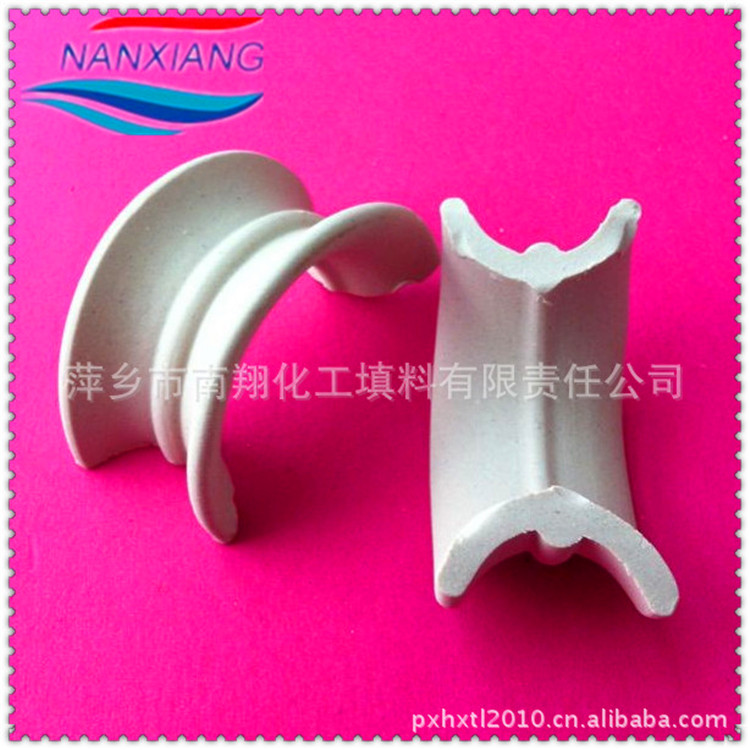 陶瓷矩鞍环填料,采用连续挤出的工艺进行加工,与同种材质的拉西环填料相比,具有通量大、压降低、效率高等优点。比鲍尔环阻力小、通量大、效率高、填料强度和刚性较好,是目前应用最广的一种散堆填料。 矩鞍环填料床层具有较大的空隙率,床层内多为圆弧形液体通道,减少了气体通过床层的阻力,也使液体向下流动时的径向扩散系数减小。陶瓷矩鞍环的形状介于环形与鞍形之间,因而兼有两者之优点,这种结构有利于液体分布和增加气体通道。陶瓷矩鞍环 由于其具有高的密度和优异的耐酸耐热性能,并且能耐各种无机酸、有机酸及有机溶剂腐蚀。陶瓷矩鞍环可用于化工、冶金、煤气、环保等行业的干燥塔、吸收塔、冷却塔、洗涤塔、再生塔等