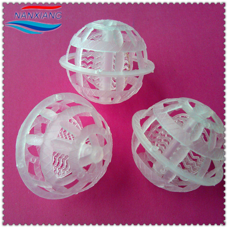 塑料网笼球填料:具有空隙率大、耐热、耐化学腐蚀,压降和传质单元高度低,泛点高、汽液接触充分、比重小、传质效率高等特点。在各种介质中的使用温度为60-150摄氏度,广泛用于石油、化工、氯碱、煤气、环保等行业的填料塔中。可广泛用于各种卧式酸贮槽、水处理中的凝储水箱和除盐水箱,大程度减少热量散失,减小酸雾及空气中的二氧化碳和氧对水的污染,保护操作人员健康,达到保持水质,节约能源,净化环境的效果。