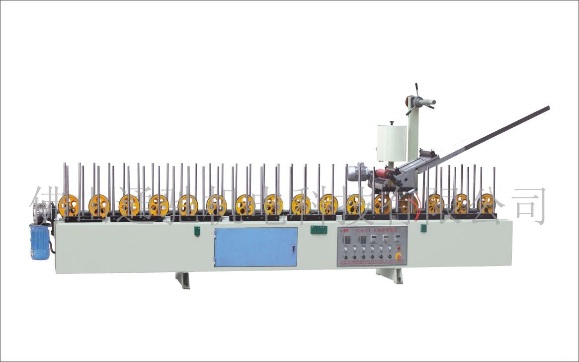 本机专门用于装饰条及铝、塑型材料等的表面覆贴PVC薄膜及三聚氨纸。采用 高标准涂胶,可包覆各种角度、圆弧、凹凸面、压槽、卷边等。适合建材、家具、桌面、门窗、装饰条或相关专业厂家使用。可将复杂形状产品表面达到完美的覆面加工。 工作原理是利用不同角度的贴面压轮对加工件进行包覆压制,在加工过程中,进程速率与包覆压因贴面材质和贴覆材料的不同,可相应的调节。全套加工流程实现了全自动流水作业,正常加工时无需人工干预,从送料到涂胶到成品包覆,仅需按行程送料即可,大大降低了人力成本,同时流水化加工模式,保证了加工产品的合格率和加工效率