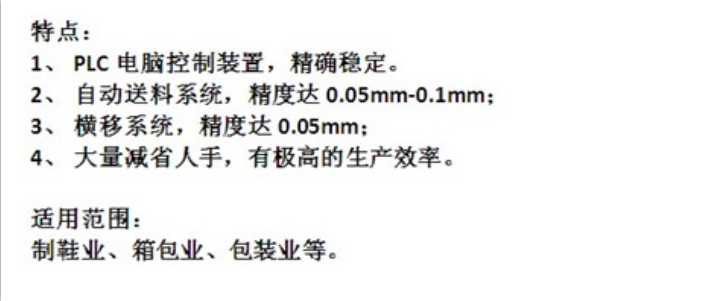 本公司设备适用于各种吸塑、海绵、EPE珍珠棉、地毯、汽车内饰、手套、箱包、拼图、EVA、PAC、PVS、塑料地板、汽车顶棚、脚垫、汽坐垫座椅、装潢材料、方块地砖、地板、地毯、足球、砂纸、抛光轮、抛光片、抛光盘、鞋垫、鞋帮、鞋底、皮革、橡胶、化纤、硬纸、尼龙、帆布、无纺布、棉麻织品及各种非金属材料的一层或多层片材及卷材利用刀模裁断使之达到成型之目的。