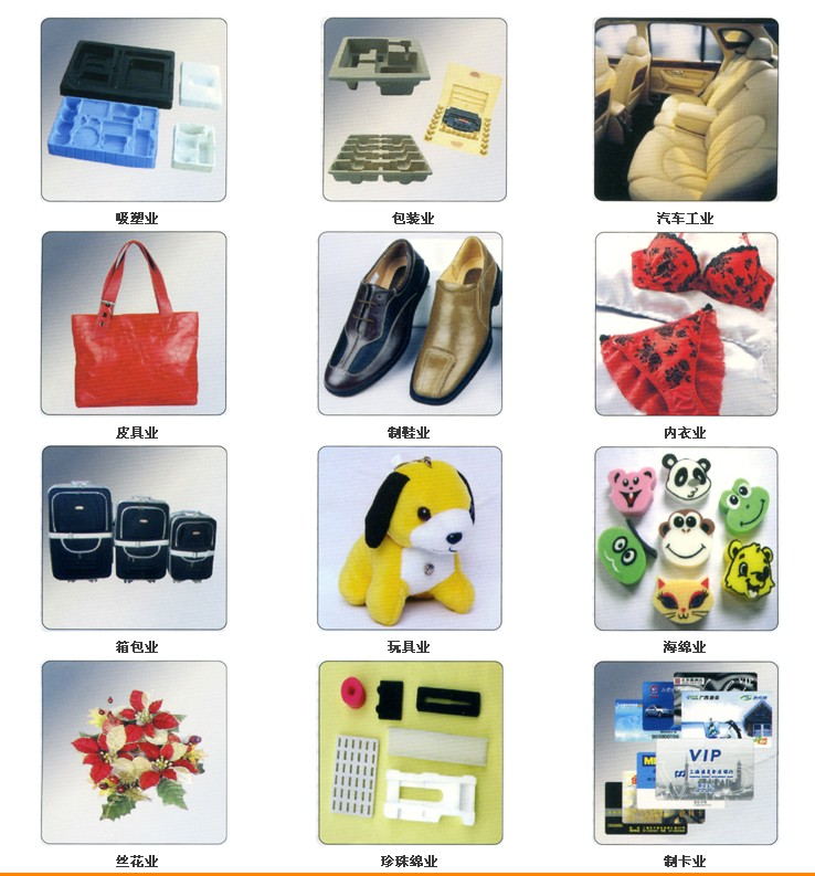 本公司设备适用于各种吸塑、海绵、EPE珍珠棉、地毯、汽车内饰、手套、箱包、拼图、EVA、PAC、PVS、塑料地板、汽车顶棚、脚垫、汽坐垫座椅、装潢材料、方块地砖、地板、地毯、足球、砂纸、抛光轮、抛光片、抛光盘、鞋垫、鞋帮、鞋底、皮革、橡胶、化纤、硬纸、尼龙、帆布、无纺布、棉麻织品及各种非金属材料的一层或多层片材及卷材利用刀模裁断使之达到成型之目的。
