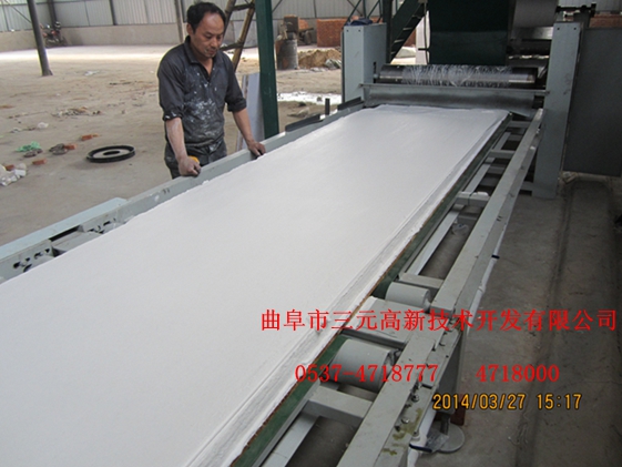 用无纺布作隔离膜,增加了韧性及强度。该机可随意上下调节,生产2-60mm厚的板材,