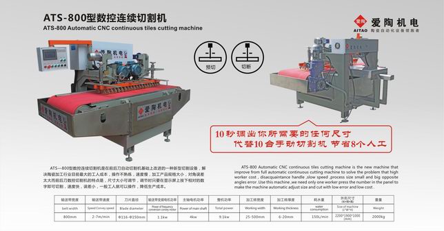 陶瓷瓷砖切割机 数控切割机 佛山瓷砖切割机 ATS-800型数控调宽切割机可谓是瓷砖加工生产中的利器,它有传统切割机无法比拟的优点: 1、数码自动调整尺寸,使你不再为多种规格的各种尺寸调整而烦恼,控制精度可达0.3mm以内; 2、前后两刀头,可对瓷砖一开二自动连续切割,具有切割后无崩边、大小头等优点; 3、破损率低,性能稳定,节能降耗,效率高; 4、可不再表面拉槽的连续作业; 5、自动监控故障状态,使维修更方便。 ATS-800型数控调宽切割机设计领先,性能稳定,节能少耗,效率高,使用成本低廉,为您带来高质量的产品及良好的经济效益。