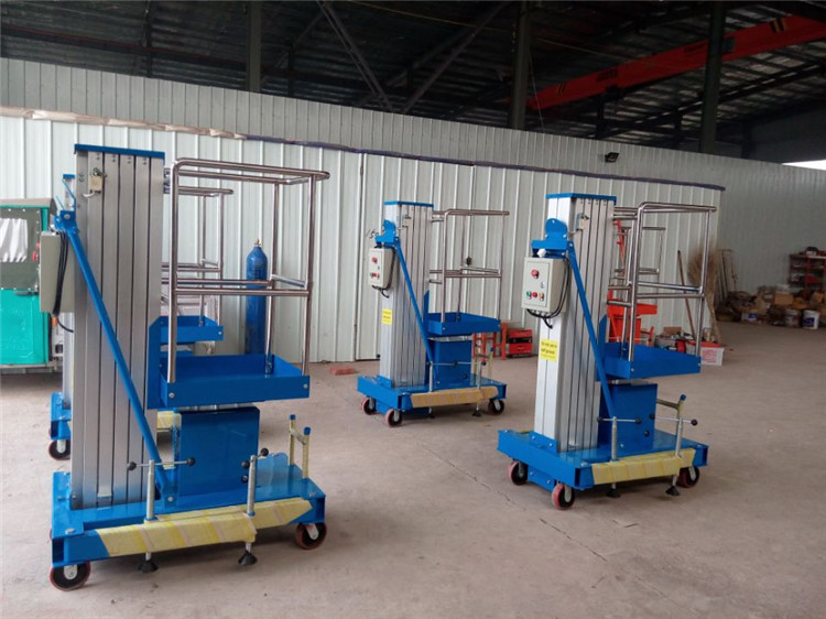 铝合金升降机:升降动力分为220V、 380V,或电瓶动力源,特殊环境也可采用防爆泵站及防爆电器。 升高4——10米, 载重100-150公斤。主体采用高强度优质铝合金材料,具有造型美观、体积小、重量轻、升降平稳、安全可靠等优点。广泛用于工厂、宾馆、餐厅、车站、影剧院、展览馆等场所,是保养机具、油漆装修、调换灯具、电器、清洁保养等用途的最佳安全伴侣。