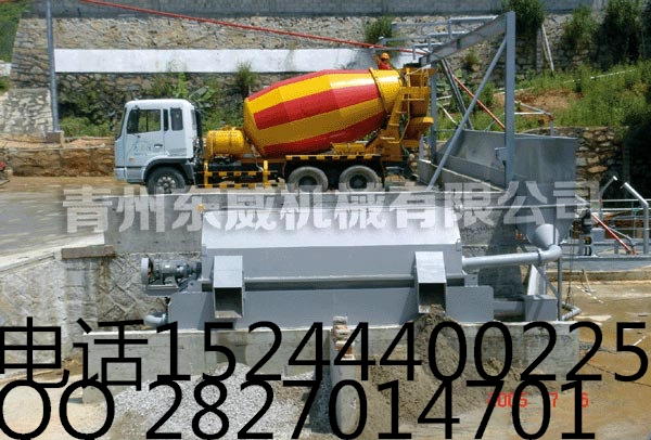 该系统主要由:搅拌车加水清洗装置,溜槽输送装置,砂石浆水分离装置,和泥浆水后处理装置组成。混凝土输送设备清洗后,将残余混凝土排入溜槽中,在高压水流冲击下,经溜槽进入砂石分离机,在不断旋转的分离机作用下,对混凝土进行充分的清洗,同时将砂、石进行分离,分离后的砂、石在导料叶片的作用下背向流动,再通过提升式出料口排出分离机,分别堆放。清洗后的浆水从分离机的底部排出进入沉淀池逐级沉淀后循环使用或进入搅拌池回收利用。进入搅拌池(一般情况2个搅拌池)的浆水为了防止沉淀凝固,需通过搅拌器的作用,搅拌器的工作为间歇式。分离出水泥浆在连续的搅拌器作用下,再通过高压污水泵输送到搅拌楼中待生产计量再利用。整个控制系统设有手动和自动控制,方便控制设置,整个系统运行可靠,故障率低,维护量少等特点。