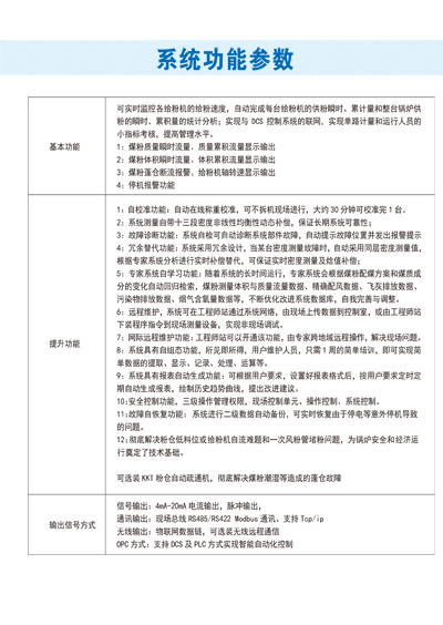本系统可自动对煤粉锅炉多个燃烧器的配煤量,进行精确计量与给粉控制,通过使用KKE均密度供粉装置、KKD计量式给粉机等设备的组合,实现稳定给粉流量,提高给粉控制精度与控制重复性,减小给粉机煤粉自流,降低锅炉最小稳定负荷等效果,为企业精细管理奠定了基础。