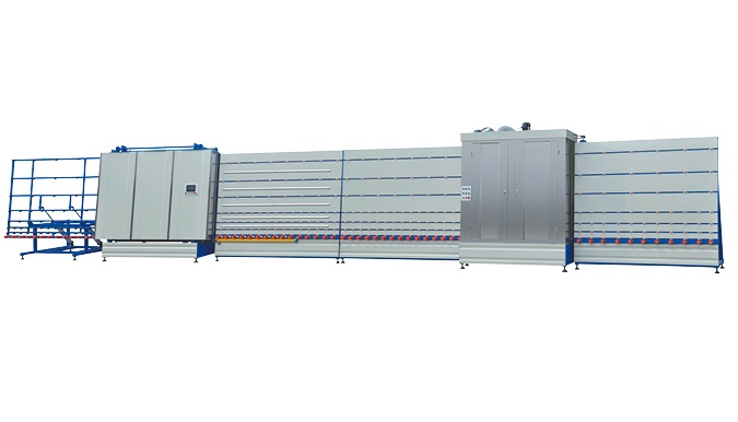 1、 整机采用六个变频 、PLC控制,触摸屏操作 ,设备多速运转优化功能。每日单班产量达1200块以上。自动识别镀膜玻璃与Low-E玻璃的膜层面提示。 2、生产线各输送部分均采用缓冲停车 功能,避免出现玻璃与玻璃及设备定位发生冲撞的现象。减小玻璃对输送轮的磨损。 3、该生产线包括进料传送机、清洗干燥机、检查传送及铝框装配机、玻璃等候机、合片平压机、翻转台。 4、清洗干燥机箱和水箱表面采用双水箱不锈钢拉丝板 制作,分室清洗确保玻璃清洗干净。外观整洁美观。传送胶辊采用耐酸碱全橡胶辊 ,可根据不同厚度的玻璃自动调节间距。三对毛刷配用高压水喷雾器,三对毛刷全部采用软质高温丝 ,防止对镀膜玻璃的表面膜层的破坏。清洗室用有机玻璃挡水板罩住,挡水板拆卸容易,便于维#修#。清洗段机箱工作时,能透过玻璃直接看到玻璃的传送及清洗情况。 5、 清洗时水由两水泵 从水箱抽出,通过喷淋水管水嘴喷到玻璃表面上,经毛刷清洗玻璃后,再流回水箱,循环使用。漂洗水箱配有水加热装置,在低温下可对水进行加热再使用。若水质较差,用户需配备水处理装置,水经水处理后进入漂洗水箱,按上述步骤循环使用。(水处理装置由用户自备) 6、检查传送及铝框装配机采用双速传送,玻璃从清洗干燥机中传出时,检查传送机低速运行,与清洗干燥机速度匹配;当玻璃后边缘通过检查传送机右侧的光电开关时,检查传送机高速运行,玻璃加速传送,双速传送既提高了生产效率,又避免了检查传送机与清洗干燥机衔接处由于传送速度不一致对输送轮造成的磨损,灯检输出部位采用选择停止功能,可随时抽样检查,及时发现未清洗干净的玻璃,充分保障成品的合格率。