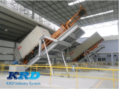 集装箱卸料平台用于将20英尺和40英尺集装箱固定在卸料平台上,选用尾部支点位置定位,通过液压油缸动力系统,实现集装箱后翻倾斜0°-65°的功能,平台在0°-65°范围内整体后翻转倾斜,实现物料从集装箱内缓慢的下滑出集装箱,并可以在0°-65°范围的任意位置停留。