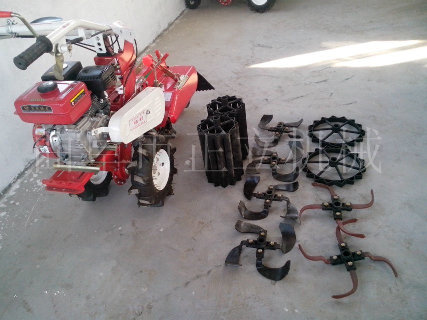 可另加农具:旋耕刀(用于旋耕、松土), 播种施肥器(用于施肥,同时播种用)、除草轮(用于除草)、耕地犁(用于耕地,也可用于深耕10公分)、扶垄器(用于起大垄)