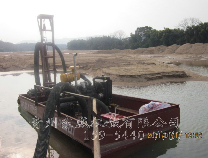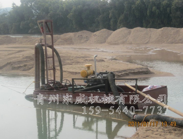 该型抽沙机主要构造包括浮体、柴油机、抽沙龙头、手动卷扬机、抽沙泵、打水泵等六部分组成,采用自动与手动相结合的方式达到抽沙的效果,主要适用于石子比例不超过20%的沙场、河道、清淤等作业环境,每小时可抽沙30-50立方,沙子输送距离60m,抽沙深度3-10m,具有体积小、造价低,能耗小,移动方便、操作简单,工作量大,易于运输等特点,是小型沙场、河道采砂的必备工具,是近几年采沙、清淤比较常用的工具。 其工作原理是利用冲水泵的冲力将沙子冲散,在沙子被冲散的瞬间,配以抽沙泵强大的吸力将沙子抽出并直接输送上岸。
