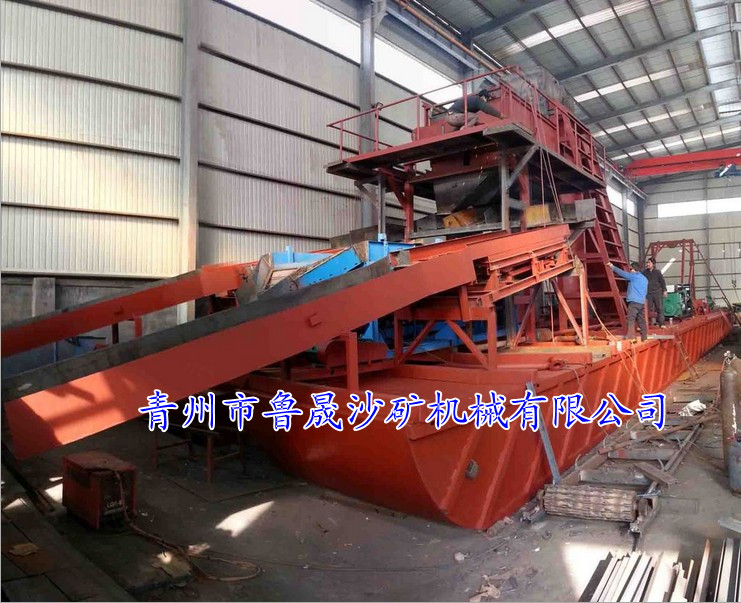 山东淘金船是一种集采矿、选矿作业为一体的水上联合工厂,是一种沙金高效开采设备,它包括挖掘系统、选矿及供水系统、废矿及尾矿排放系统、甲板机械、船体、驾驶舱、上部钢构、供电等几个基本系统。从选矿工艺上,所配采金设备分为固定溜槽、鼓动溜槽、蠕动溜槽、离心机等几种类型;从采掘能力上,采金船每小时处理毛料10-300m3。 淘金部分为黄金精选机,震动提金设备,从挖掘.筛选.分级提取, 段首工作原理:利用链条挖沙斗装置采沙选矿的机械,动力采用柴油机或柴电驱动,利用挖沙斗将河流深层的沙石挖掘上来,同时完成黄沙、沙金的采掘、筛选,清洗、分级等工艺,安装黄金精选机以及振动提金装置,从重选、细选、到精选,提金率达≥90%。