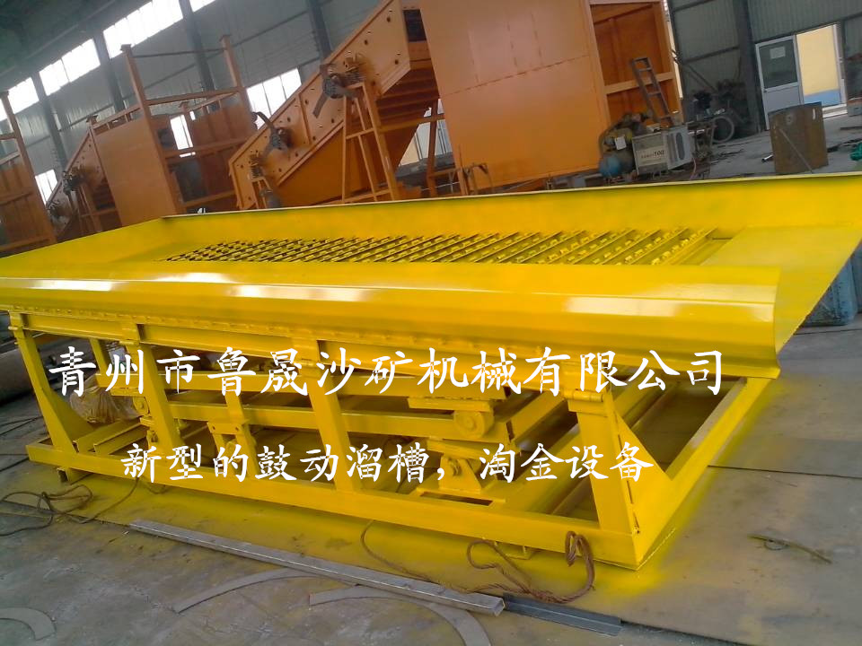 溜槽淘金是利用金与沙子比重的差别,矿浆流经溜槽,比重大的金沉淀于底层,沙子等比重小的浮于上层随水流排出工作区。原先的固定式溜槽是用淘金毡提金,由于溜槽板结、淤槽等现象,淘金毡提金的净选率只有30%左右,这些缺点,鼓动式溜槽有针对性的进行了克服--它的底板用硅胶板制成,利用机械鼓动底板,使底板缓慢鼓动,克服泥沙板结,周期性鼓动,完成分层和排沙,从而使得净选率提高到90%左右。
