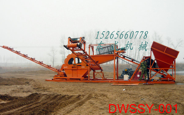 筛沙水洗一体机工作时,电机通过三角带、减速机、齿轮减速后带动上料机,均匀给料到滚筛进行筛分,合格产品经过溜槽进入洗槽中,此时链斗装置的动力系统带动四角轮缓慢转动,在链斗的带动下翻滚,并互相研磨,除去覆盖砂石表面的杂质,同时破坏包覆砂粒的水汽层,以利于脱水;同时加水,形成强大水流,及时将杂质及比重小的异物带走,并从溢出口排出,完成清洗作用。干净的砂石由挖斗提起,最后砂石从上四角轮倒入出料槽,完成砂石的清洗作用。