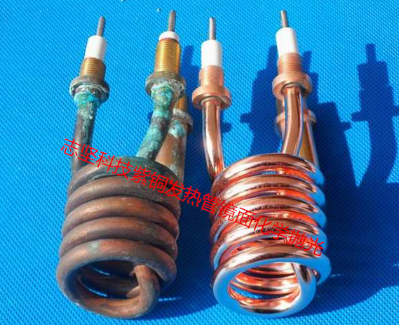 将兑好水的化学抛光液用石英加热棒进行加温到45-55度,,黄铜可常温抛光,紫铜抛光温度45度,然后将铜件浸泡到该药液里面,黄铜抛光2-3分钟,紫铜抛光3-5分钟,拿出冲水即可达到效果,该抛光工艺黄铜无需退膜。