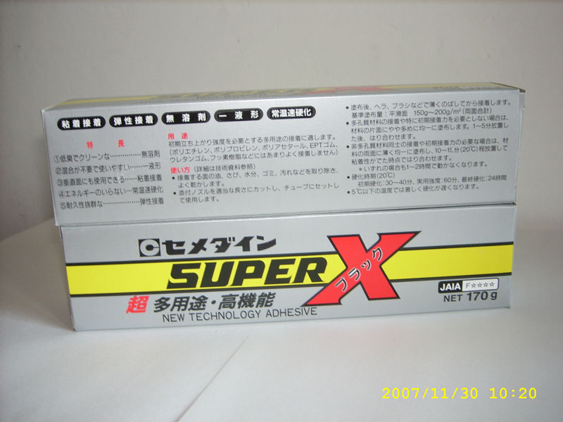 日本施敏打硬CEMEDINE Superx8008硅胶 CEMEDINE(施敏打硬)Superx 8008 AX-084 、 CA-114 、PP5-200 、 CA-285 、 CA-119 、 PP5-3 、CA-243、RE-215 、 AR-128 、 RE-082 、 CA-135、AR-131 、CA-133、 RE-194、RE-187 、 AR-132、 CA-290 、EP001-2 、 CA-175、1500 、RE-001 、 AP-080 、 RE-004 、 CA-186 、 CA-159 、 AX-022 、AX-011 、 NO575-500 、 NO575-1 、 AX-035 、 NO8008-333W 、 NO575-3 、 AX-039 、 AX-096 、NO575-180 、 CA-327 、 AX-038 、 SUPER3000K 、CA-307 、 NO3000RX-50 、CA-155、、CA-156 、 CA-303 、 NO3000RX-20 、CA-154 、CA-305、 CA-306、 CA-294、 CA-292 、 AX-067 、 AX-040 、SX720W 特点: 1.常温速硬化:10~30分钟 2.单组分,无溶剂环保。操作容易,安全。 3.超多用途:适合各种金属,塑料,木材,陶瓷,布类,石材等。 4.优越的耐久性和电器特性:弹性接着剂,强韧,柔软。优越的膨胀,收缩率。高低温耐久性-60℃~+120℃。 5.高性能:耐水,耐油,耐介质。 6.树脂系接着剂接着,填缝,固定使用于电子零件和机构设计上的填缝与接着,可用单组份型的产品操作因单组份易于使用,不需混合.,胶质本身不含腐蚀成份。 1.贮存稳定,使用方便 2.快速固化,强度好 3.耐化学品及溶剂 固化后对于一般溶剂与化学药品具有良好低抗性 4.室温硬化无须加热或添购设备 5.硬化时间短,减少库存累积 6.单液型不需混合 外观:黑色,白色、透明粘度:100P 密度:1.26 硬度:40 断裂强度(N/mm):2.0 施敏打硬SUPER X 8008 品牌: 施敏打硬,CEMEDINE,SUPER X 物性:施敏打硬CEMEDINE工业用接著剂之SUPER X (8008,8008L)颜色有黑色、白色.透明色。 产品优点: SUPER X 8008:一液型速硬化弹性粘合剂、无溶剂、、无毒性、耐热、耐寒性好、用途广泛。合乎环保要求、减省工序、社合应用于污垢、危险及应用技术有困难的地方。 SX720W,SX720B性能等同于8008,它是通过美国UL国际安全认证之材料,因此,它可完全满足需求通过UL的客户及产品的使用。CEMEDINE 1500:二液型、常温硬化环氧树脂粘合剂,无溶剂、耐热、耐候、耐水、耐油、耐溶剂及耐药品性良好。用途广泛,适用于电子、电气产品元件的密封及粘合。日本“超多用途无溶剂型高机能弹性接着剂”是最新一代高分子粘合剂,其具有的粘接范围广,粘接强度高,弹性好,耐冲击,抗震,清洁环保,绝缘性好,极耐老化,使用方便等优点,使之能很好的解决粘接方面的许多难题,从而节省粘接成本,提高工作效率,提高产品品质。 一. 特性:该胶粘剂系单液型高分子聚合物产品,它是利用空气中所含湿汽成份来固化,粘度极高,垂直面几乎不垂流,固化后系弹性,耐老化耐湿热极好,可耐低温--40℃,耐高温120℃。 二. 用途:本胶粘剂粘接范围特广,粘接金属,不锈钢、铝、铜、铁、钢、合金锌等;树脂,尼龙、苯乙烯、丙烯树脂,塑料、ABS树脂;FRP、各种橡胶,天然橡胶、合成橡胶、混合橡胶;EPDM、无机材料,混凝土、灰浆、天然石、瓷砖、玻璃、陶瓷;天然材料,木材、合成纤维皮革、布、厚纸板等均可粘接。 三. 使用方法: ① 先将粘接物作业表面清洁处理,去除锈迹、油污、灰尘、水汽等,使之干爽清洁。 ②在处理过的作业表面均匀涂胶,若两面都涂胶时则涂胶薄厚必须均匀。③将涂过胶的粘接件定位组合后固定5-10分钟,期间不得发生任何移位,使之初步固定。 ④粘接组合后初步固化要1-2小时,完全固化要24小时以上。 ⑤若因产生移位而没能粘接好的组件要再次涂胶粘接。 ⑥为使粘接组件尽快粘好,涂胶定位后请将之放置在通风处。 ⑦本胶粘剂不能用来粘接衣物。 ⑧使用时请不要让未使用之胶粘剂长时间接触空气。 四、保存方法: ①将用剩余部分之筒口清洁干净后放置在干燥阴凉处,如情况允许,则最好将整筒一次用完或在使用前根据所需量选择合适包装,因本胶粘剂开封后不宜久存。 ②请将其放置在远离孩童处,并远离火种存放。 ③用后之空筒请不要燃烧,作为垃圾处理即可。 五、包装方式:333ml、170g、135ml均有供货。 六、末尽之处请联络本公司业务部