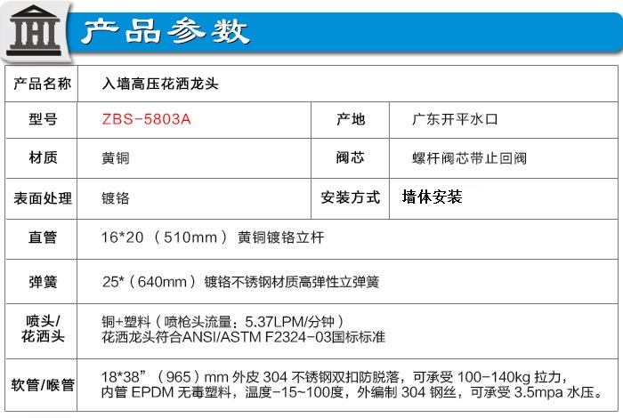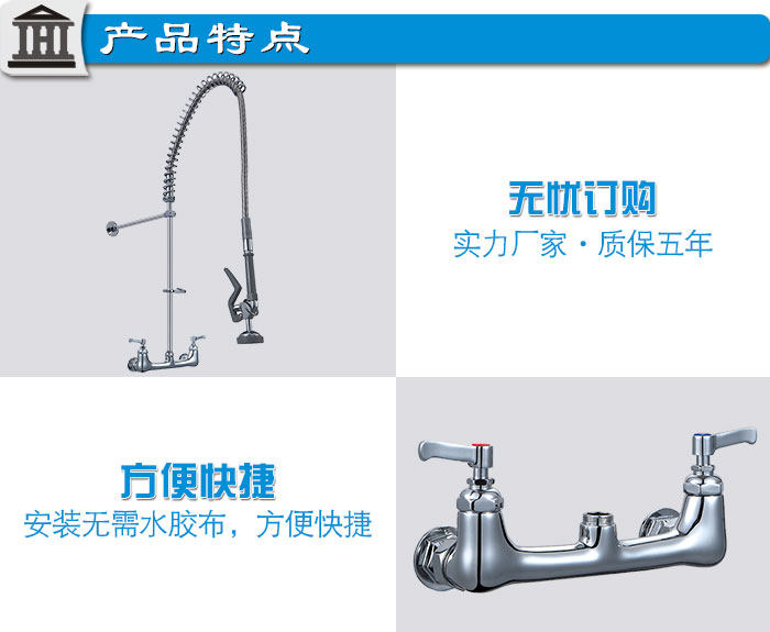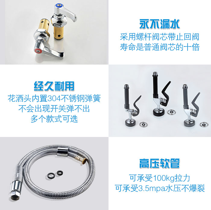 圳镈钏高压花洒龙头厂家生产的入墙式高压花洒龙头是一款商用厨房设备专用花洒,是酒店酒楼宾馆餐厅厨房洗碗机专用清洁花洒,这款 座台式全铜高压花洒冷热水龙头是酒店餐厅预冲洗龙头,这款高压弹簧花洒龙头是洗碗机、洗碗池、不锈钢水槽、商用下水、杀鱼台、酒店工程常配备的清洗高压花洒龙头。