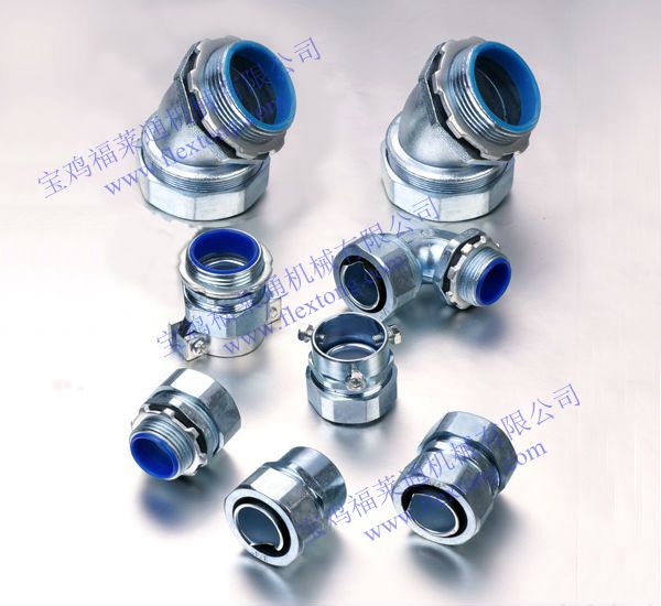 45度接头带金属环的一端与金属软管连接,另一端螺纹连接穿线盒,开关箱,配电箱,电机等。