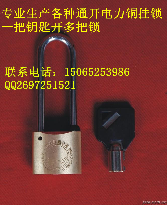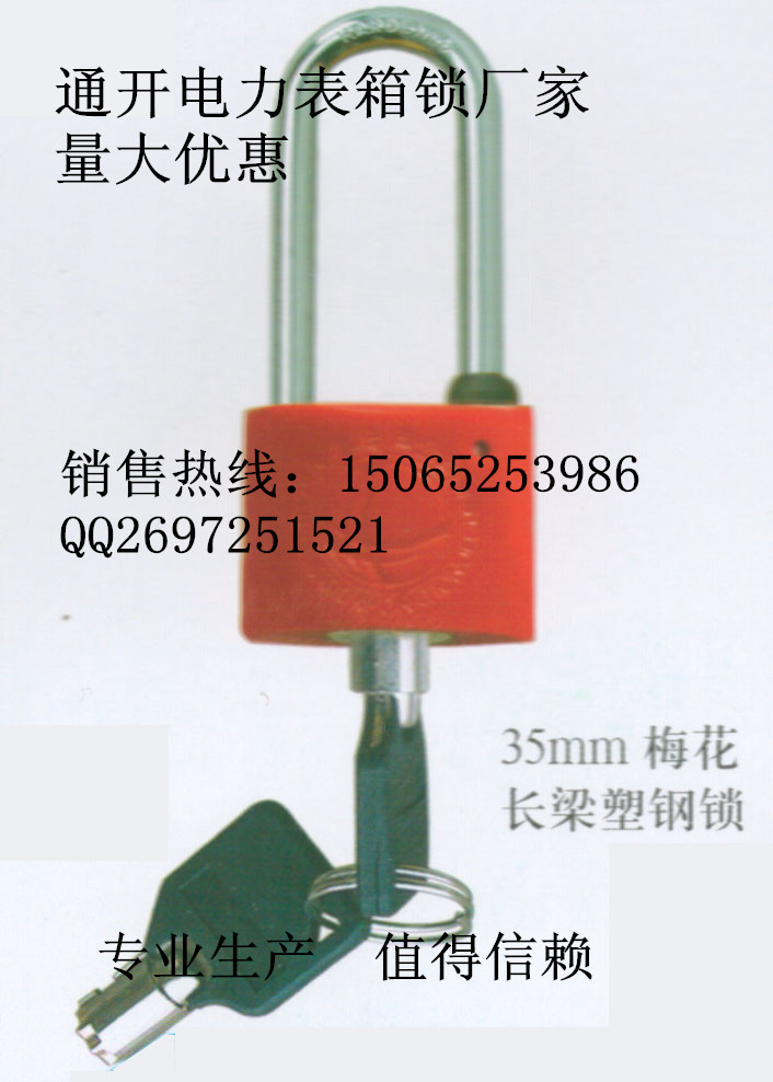 童经理 电话 15065253986 QQ2697251521 我公司专业生产电力表箱锁,材质为纯铜,镀铬,塑钢,铜镀铬等,规格有30、35、40、50、60、70MM等规格,适用于电力、电信、网通、天然气公司、自来水公司表箱外挂用,具有一匙多开(即通开),也可以单开,产品表面可以冲压图案和文字等。是国内生产电力锁具、防伪铅封、电力安全工器具专业厂家。生产各种电力锁具。产品主要有电表箱锁系列(铜挂锁,长梁防水塑钢挂锁,镀铬镀镍锁)各变压器防盗锁系列。