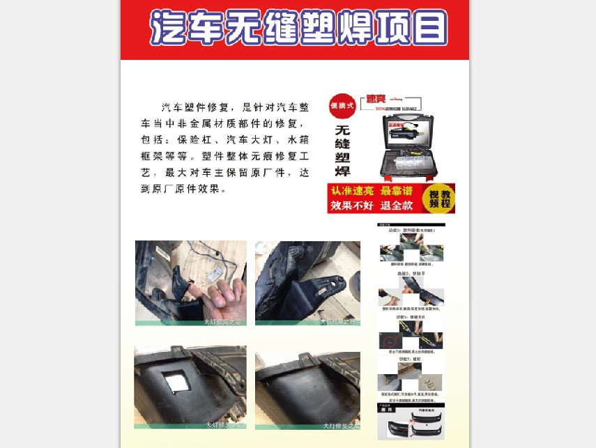 汽车无缝塑焊项目: 汽车塑件修复,是针对汽车整车当中非金属材质部件的修复,包括:保险杠、汽车大灯、水箱框架等等。塑件整体无痕修复工艺,最大对车主保留原厂件,达到原厂原件效果。 寿光市速亮汽车服务有限公司是集汽车修复和汽车美容为一体的汽车服务型公司。 经营范围:大灯修复,大灯改色,玻璃修复,玻璃凹陷以及汽车修复工具等。