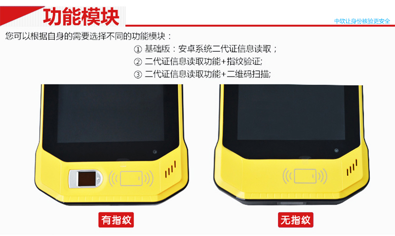 人证同一性个人信息采集与核验轻终端,广泛应用在需要居民出示身份证进行验证的场所,用国际上先进的Tybe-B非接触IC卡阅读技术,通过内嵌的专用身份证安全加密控制模块(SAM),以无限传输方式将芯片内的个人信息资料读出,再通过计算机中的阅读软件,将信息解码成文字和照片进行显示,可以读取二代证中的指纹进行比对。