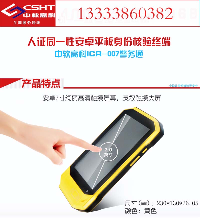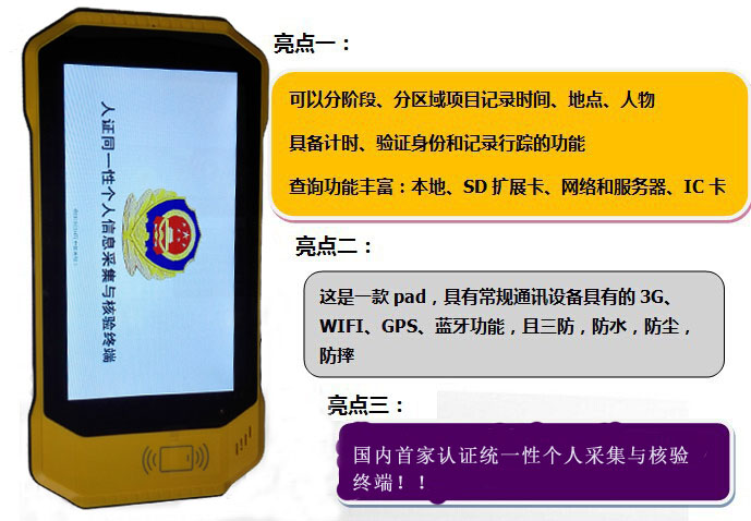 平板ICR-007智能执法终端是目前全国领先水平的二代证专用警务装备,该产品采用Android 4.4智能操作系统,拥有二代证识别器、掌上电脑、高清数码相机、GPS定位导航、3G无线网络高速传输等强大功能。终端采用安全性和电量密度最高的聚合物电池。ICR-007终端也可灵活使用于公安、交警、民政、银行、政法、税务、工商、宾馆、民航、邮局、证券、社保等行业进行第二身份证核验,或专用与NFC/RFID卡应用行业的读卡终端。ICR-007终端系统以3G和物联传感设备为基础平台,为公安、交警等执法系统,提供系列化智能执法终端解决方案。